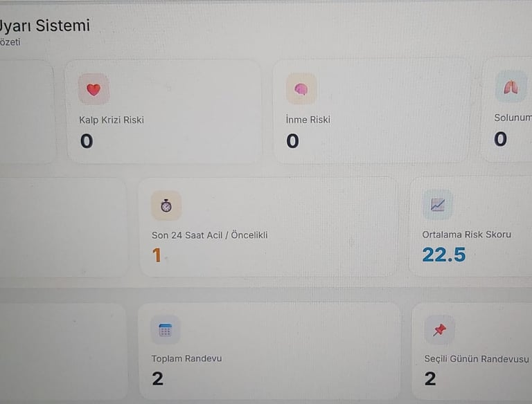 Yapay zeka destekli risk paneli hastalardan gelen verileri analiz ederek kritik sağlık risklerini erken aşamada tespit eder.