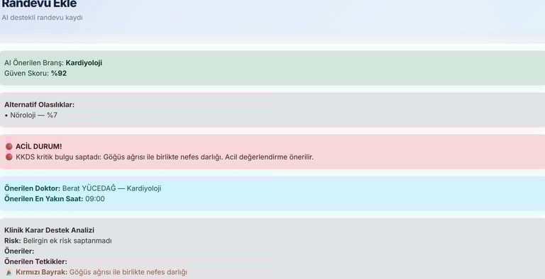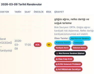 PulseIQ Klinik Karar Destek Sistemi, hastaların şikayetlerini ve risk analiz sonuçlarını değerlendirerek en uygun branş ve doktor önerilerini sunar. Sistem aynı zamanda acil durumları tespit ederek sağlık ekiplerini uyarır ve hastaların en hızlı şekilde doğru uzmana yönlendirilmesini sağlar.